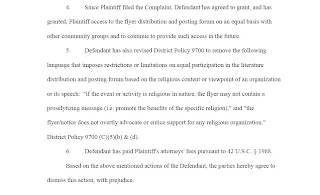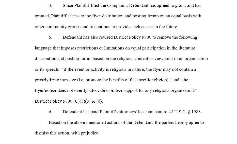 After submitting its materials, the church received no response. The assistant superintendent later informed the principal that the fliers would not be distributed. As part of the settlement, however, the school board agreed to revise its policies prohibiting religious organizations from distributing materials through the school flier forum.
