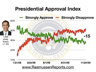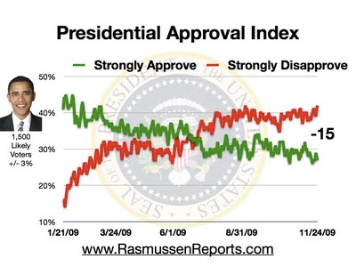 Labels: PollsUpdate 11/25/2009 For second straight day Obama's approval rating remains at it lowest ever measured by Rasmussen's daily approval polling. and Republicans tie their best lead in the Generic Congressional Ballot weekly poll at Rasmussen.